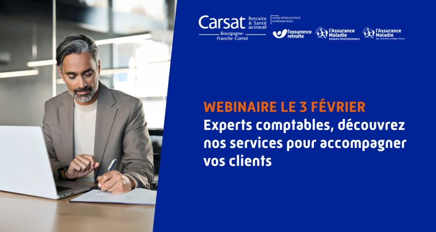 La Carsat Bourgogne-Franche-Comté, en partenariat avec l’Ordre des experts-comptables, invite les experts-comptables à un webinaire de présentation de l'offre de services. Notre objectif : vous permettre d’accompagner vos clients dirigeants et travailleurs indépendants autour des risques professionnels, du maintien en emploi et de la retraite.